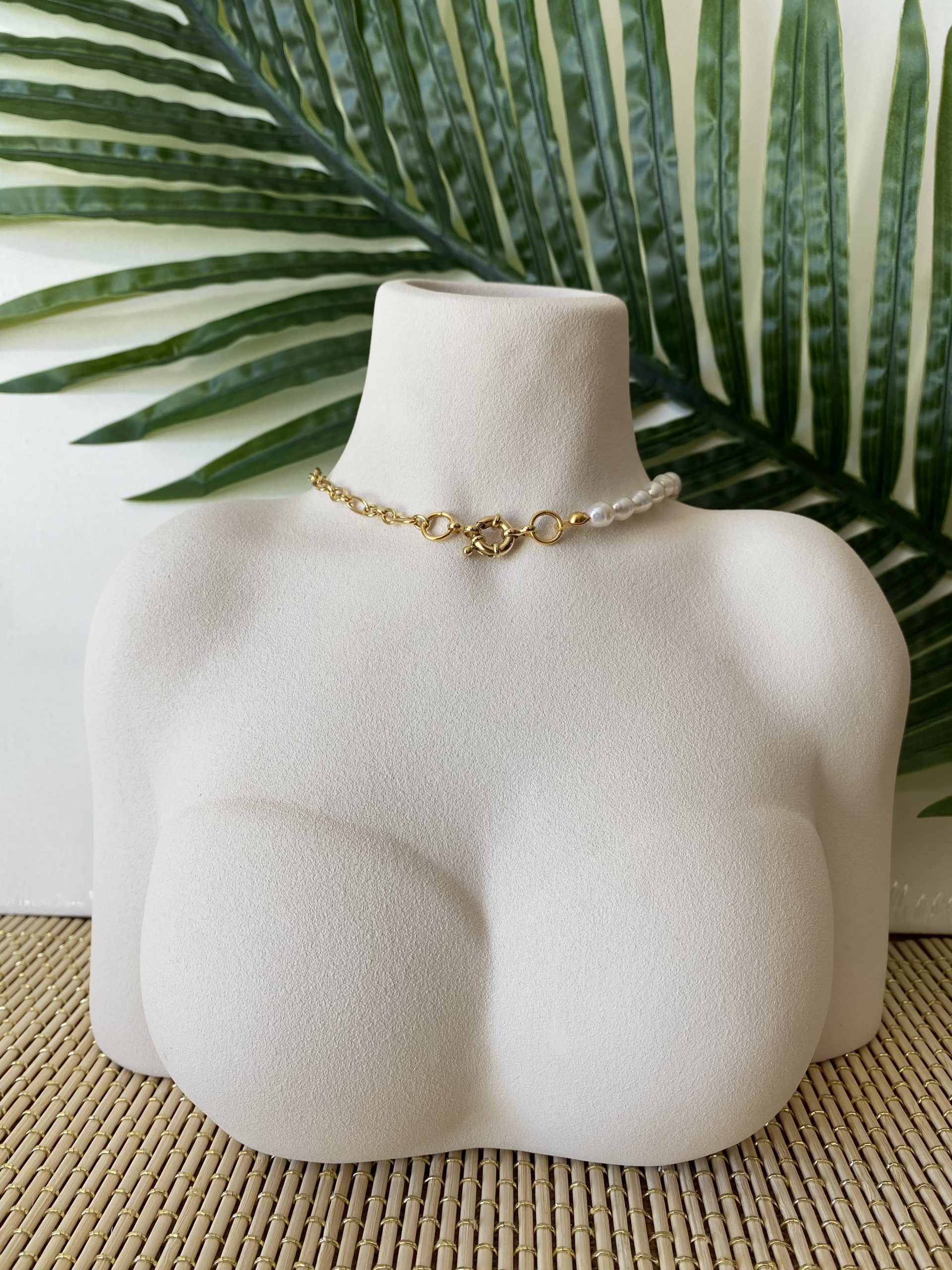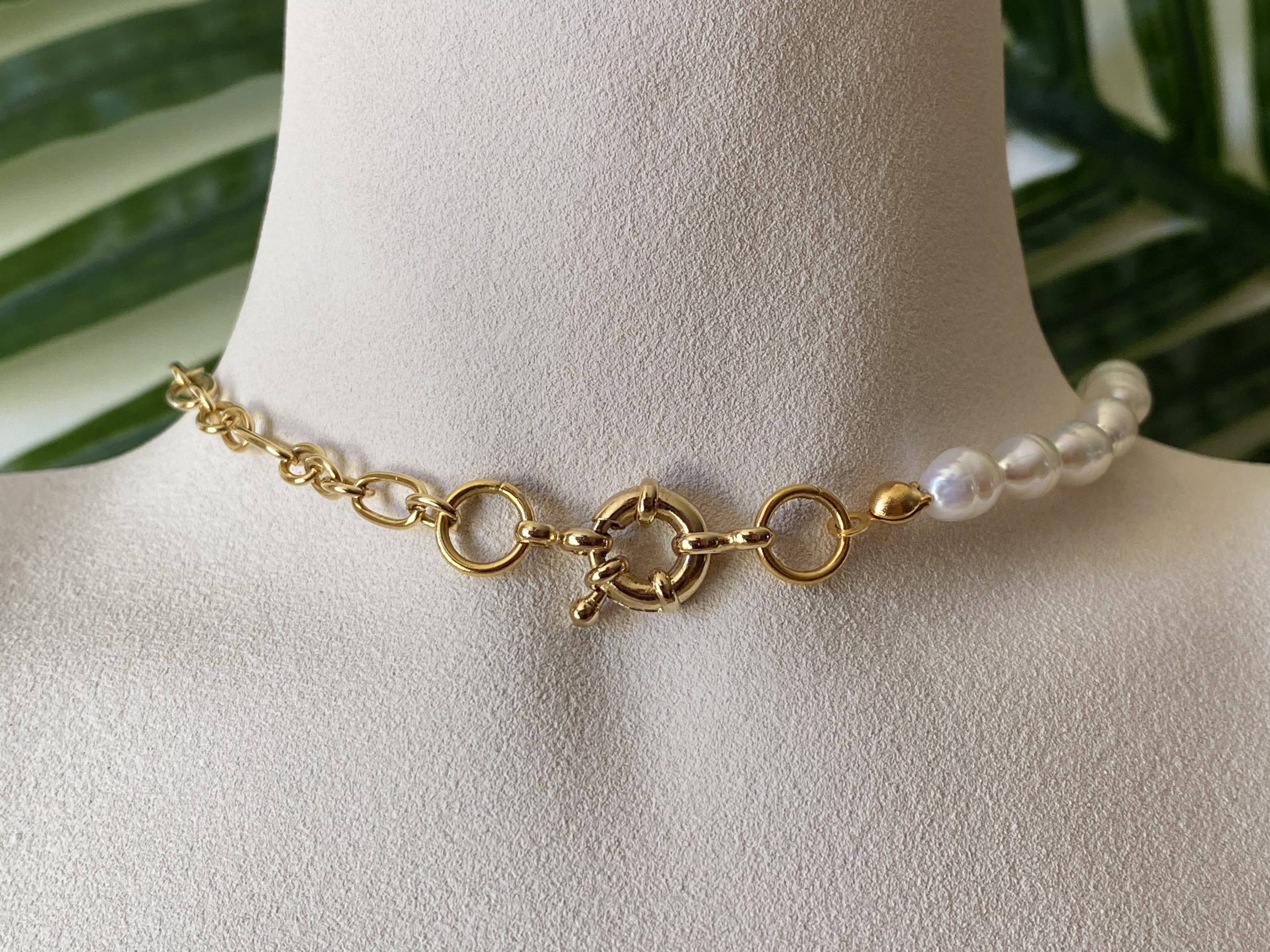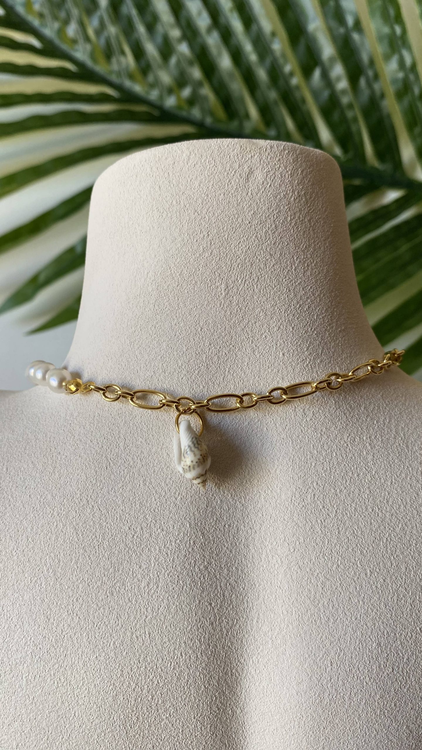 Un bijou fait à la main avec une chaîne à mailles ovales en acier inoxydable, un fermoir à ressort, des anneaux ainsi que des perles d’espacement en laiton doré en or 24k, des perles d’eau douce et un pendentif en Columbelle (coquillage)