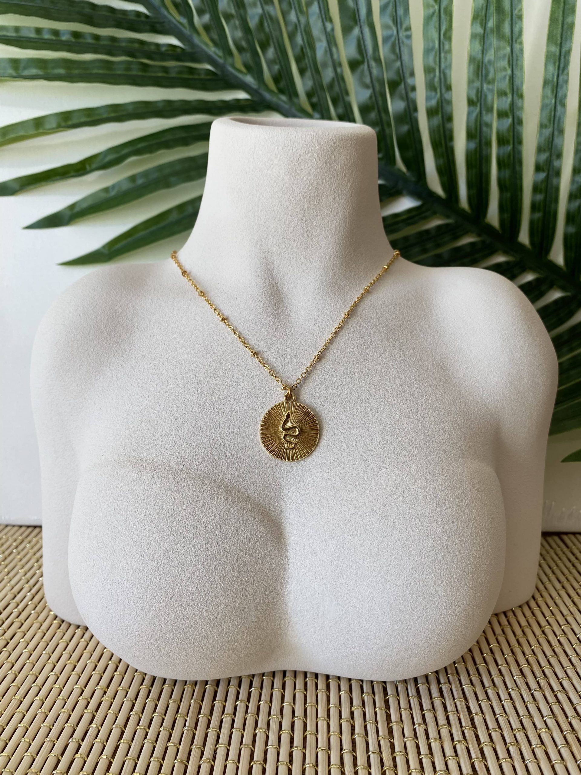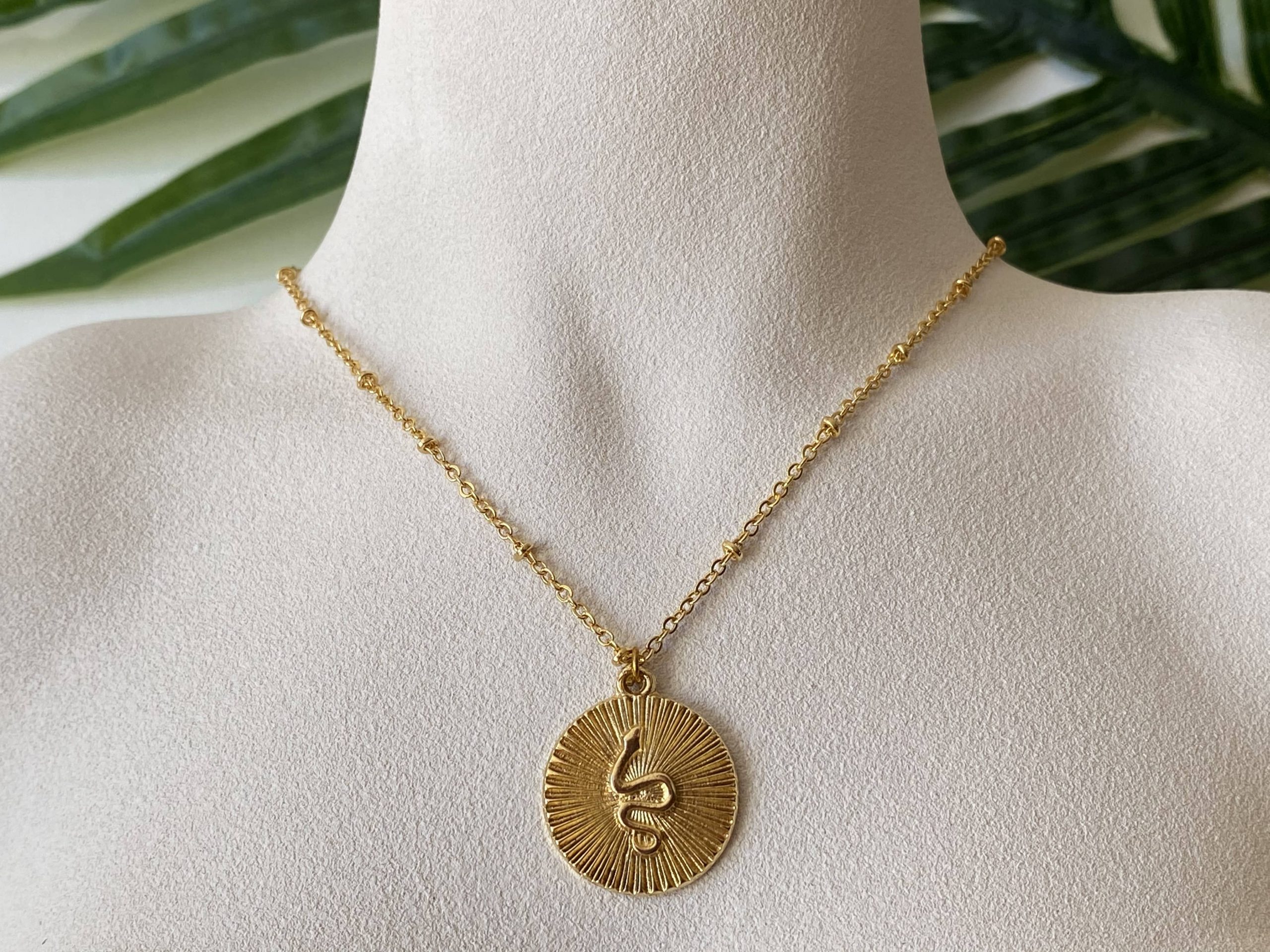 Un bijou fait à la main avec un pendentif orné d’une gravure serpent, ainsi qu’une chaîne à mailles fines, le tout en laiton doré à l’or fin 24k